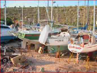Life in a boat yard is not something that boaters look forward to. There is the inconvenience of hauling everything up and down a long ladder, having to be quite careful of what and when anything is allowed to go overboard (i.e. water from a sink), the noise and activity that is part & parcel of a boat yard, etc. etc. Actually, after a little time of getting used to things, we realized that we had a GRAND view of the entire Bay of La Paz and of beautiful sunsets, it is usually quite quiet during the evening and night hours, and we could get a lot accomplished while in the yard. There is often some sort of activity going on that is somewhat interesting or just plain funny to watch, as well. This boat yard is packed with boats “on the hard”, stored for weeks or months or even years, and observing the Bercovich brothers move boats around in order to get them in or get them out is very interesting.