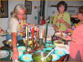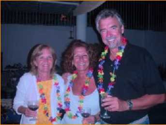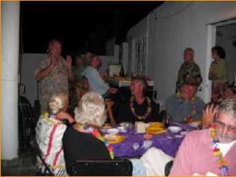 After talking and imbibing for a while, a dinner of carnitas tacos and salad was enjoyed, followed by stories-to-tell-about-Martin, which brought lots of laughs and applause. There was a delicious cake, and a toast with champagne to round out the evening. A good time was had by all!! O yes - and everyone got "lei-ed", too...!!